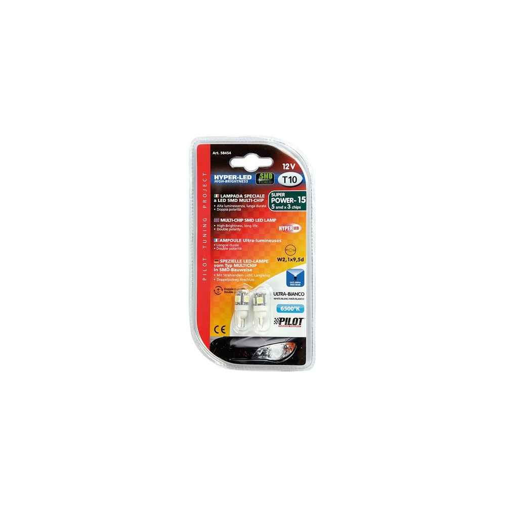 12V Hyper-Led 15 - 5 SMD x 3 chips - T10 - W2.1x9.5d - 2 pz in blister - Bianco - Doppia polarita'