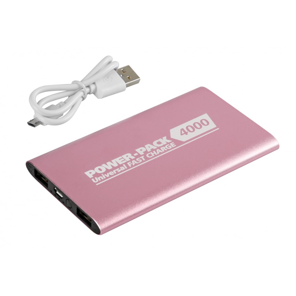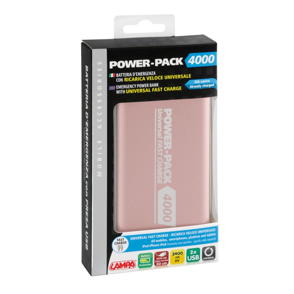 Capacità 4000 mAh - Uscita: 2400 mA (tot.). - Cavo Micro Usb da 30 cm incluso.
