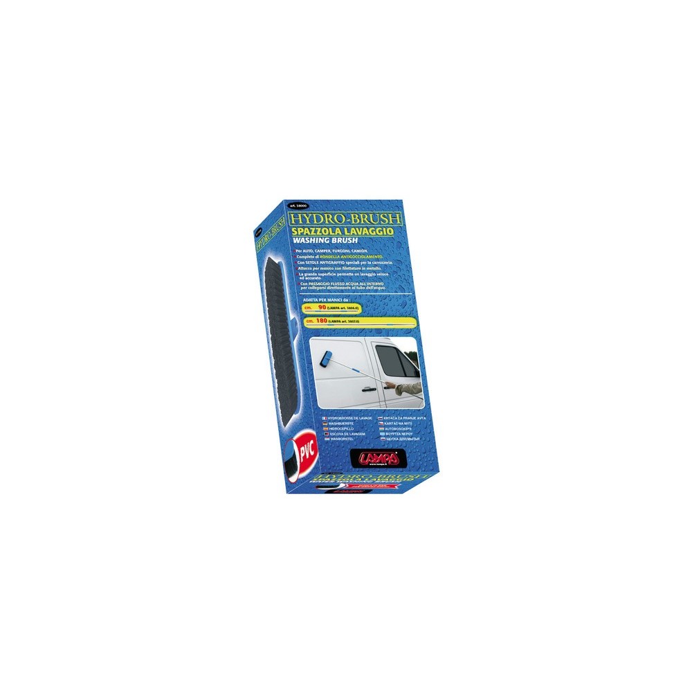 Cm 7,5x24. Per auto, camper, furgoni, camion. Completa di rondella antigocciolamento. Con setole antigraffio speciali per la carrozzeria. Attacco per manico con filettatura in metallo. La grande superficie permette un lavaggio veloce ed accurato. Con passaggio flusso acqua all'interno per collegarsi direttamente al tubo dell'acqua