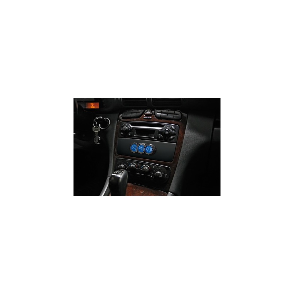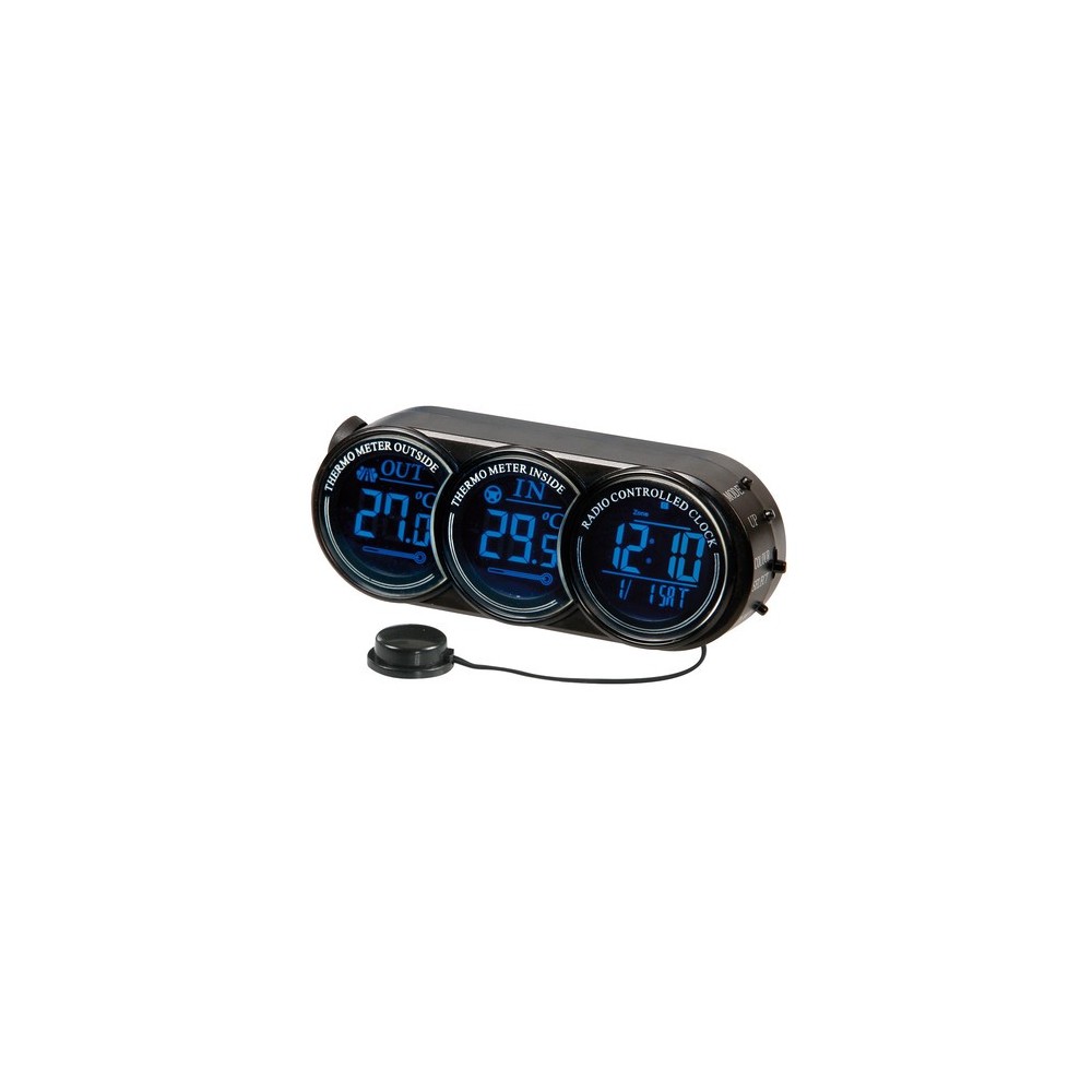 Orologio radiocontrollato con termometro interno/esterno. Illuminazione a 2 colori selezionabili (bianco e blu) tramite spinotto accendisigari 12/24V. Cavo da 200 cm. Piedistallo in metallo. Fissaggio tramite biadesivo speciale. Batteria in dotazione con ricambio