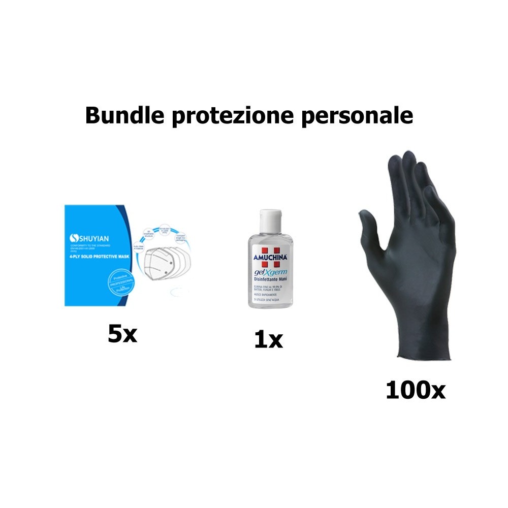 Kit bundel protezione 100 guanti nitirle L + 5 mascherine FFP2 + Amuchina X-germ 80 ml